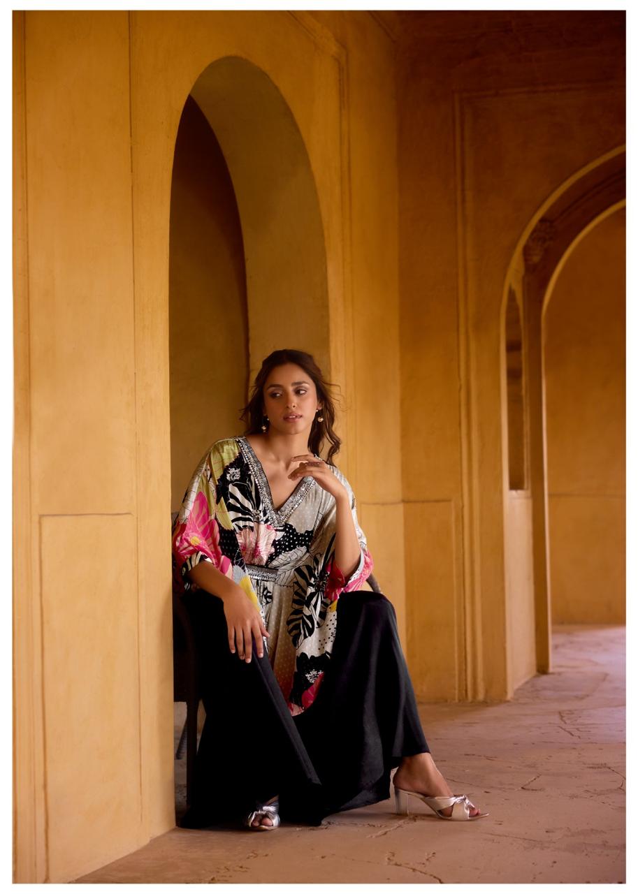Turn heads with this statement-making printed kaftan top and solid black palazzo set — the perfect fusion of comfort and drama. The kaftan features bold floral and abstract prints in shades of ivory, black, pink, and mustard, enhanced with sequin detailing along the neckline and waistline for a touch of sparkle. The flowy silhouette, relaxed sleeves, and cinched waist give it a flattering yet effortless appeal. Paired with wide-legged black palazzos, this ensemble is perfect for intimate gatherings, resort getaways, or evening soirées.