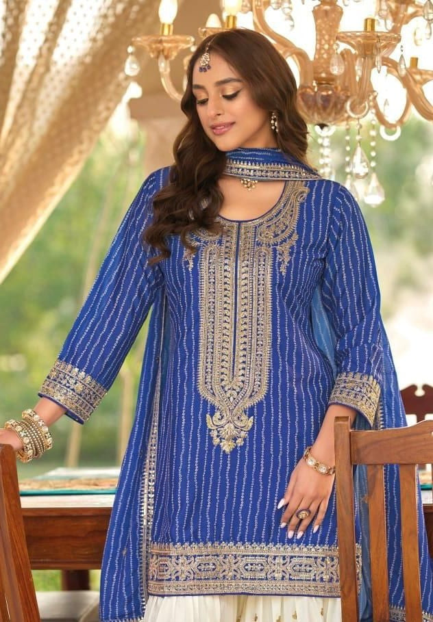Unveil your inner regality with this striking Royal Blue & Ivory Embroidered Sharara Set, where tradition meets grandeur. The rich royal blue kurta is adorned with intricate gold zari embroidery, sequin highlights, and delicate stripe detailing, exuding timeless festive elegance. The neckline and cuffs are beautifully accentuated with ornate borders that add depth and dimension. Paired with an ivory sharara featuring delicate gold motifs scattered all over and an exquisitely embroidered hem, this ensemble radiates sophistication. The matching blue dupatta, with embroidered accents and elegant borders, completes the look with a graceful finish.