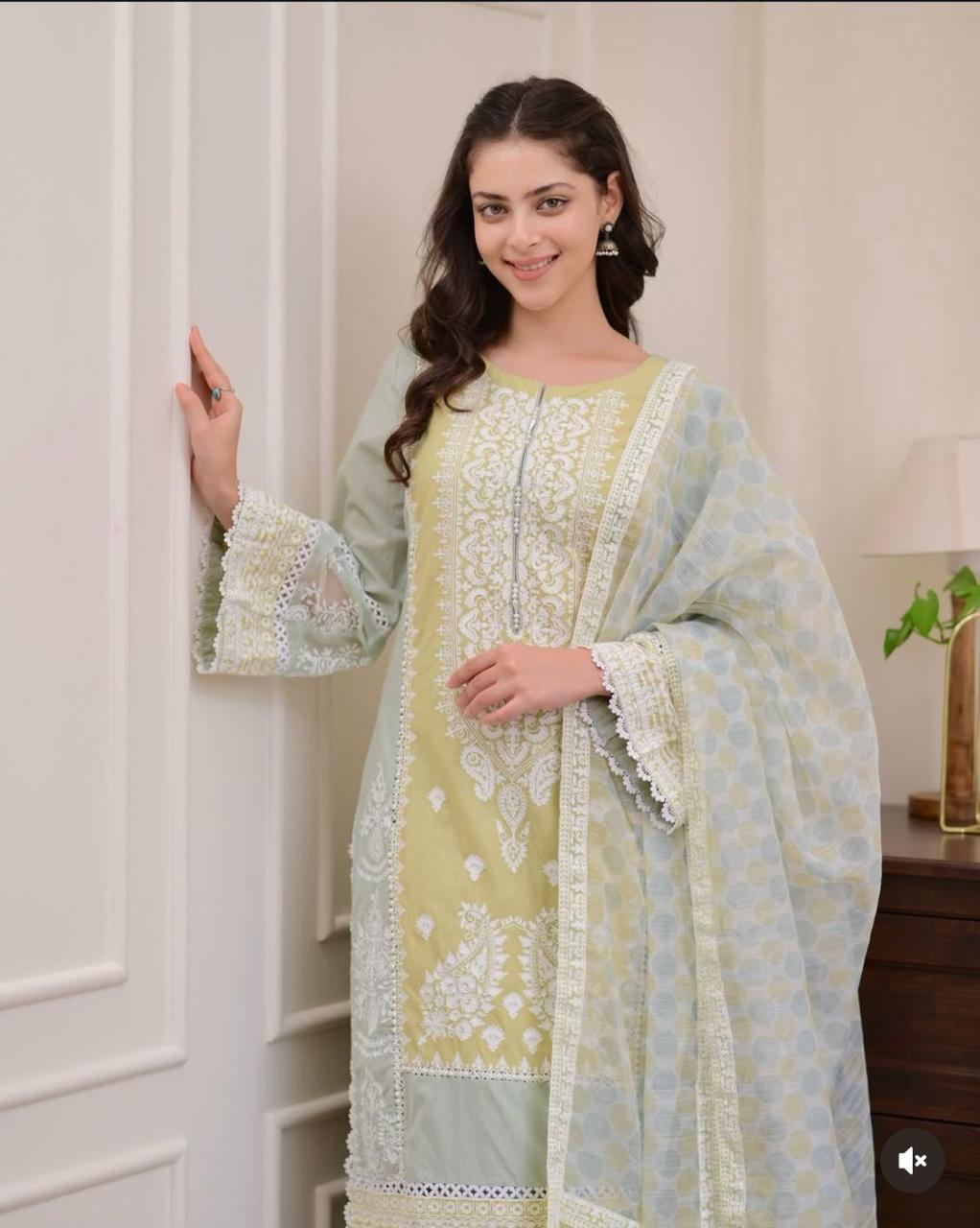 Embrace the charm of subtle elegance with this beautifully crafted Pastel Green and Lime Embroidery Suit Set. The kurta features a serene mint green base, elevated by a central lime yellow Embroidery panel adorned with intricate white threadwork and delicate lace detailing on the sleeves and hemline. Paired with matching mint green pants, enhanced with lace inserts and Embroidery trims, this outfit speaks volumes of understated sophistication. The ethereal net dupatta blends soft lime and mint hues with Embroidery floral motifs and lace borders, creating a breezy and refined finish.